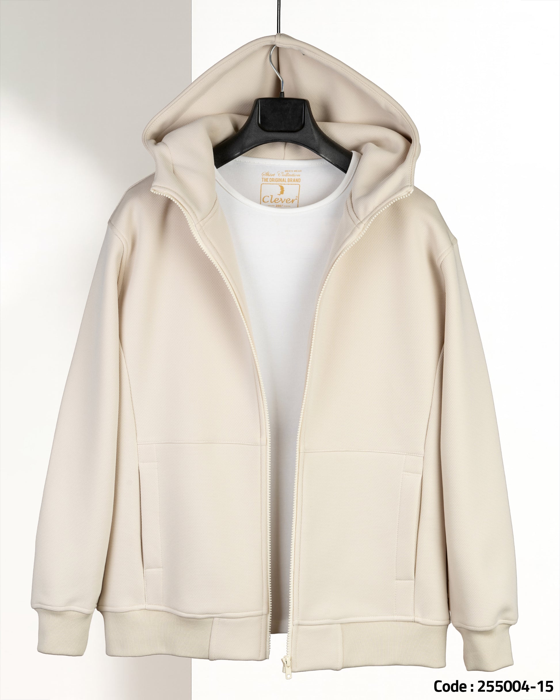 Beige Full-Zipper Plain Cotton Hoodie
